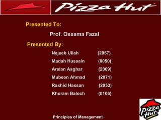 This document summarizes the human resource management practices of Pizza Hut. It discusses Pizza Hut's history and operations globally and in Pakistan. It then describes Pizza Hut's HR activities like recruitment, training, performance appraisal, incentives, and benefits. It provides details on Pizza Hut's recruitment process, types of training, and performance review system. The document concludes with recommendations to further improve Pizza Hut's HR management and business operations in Pakistan.