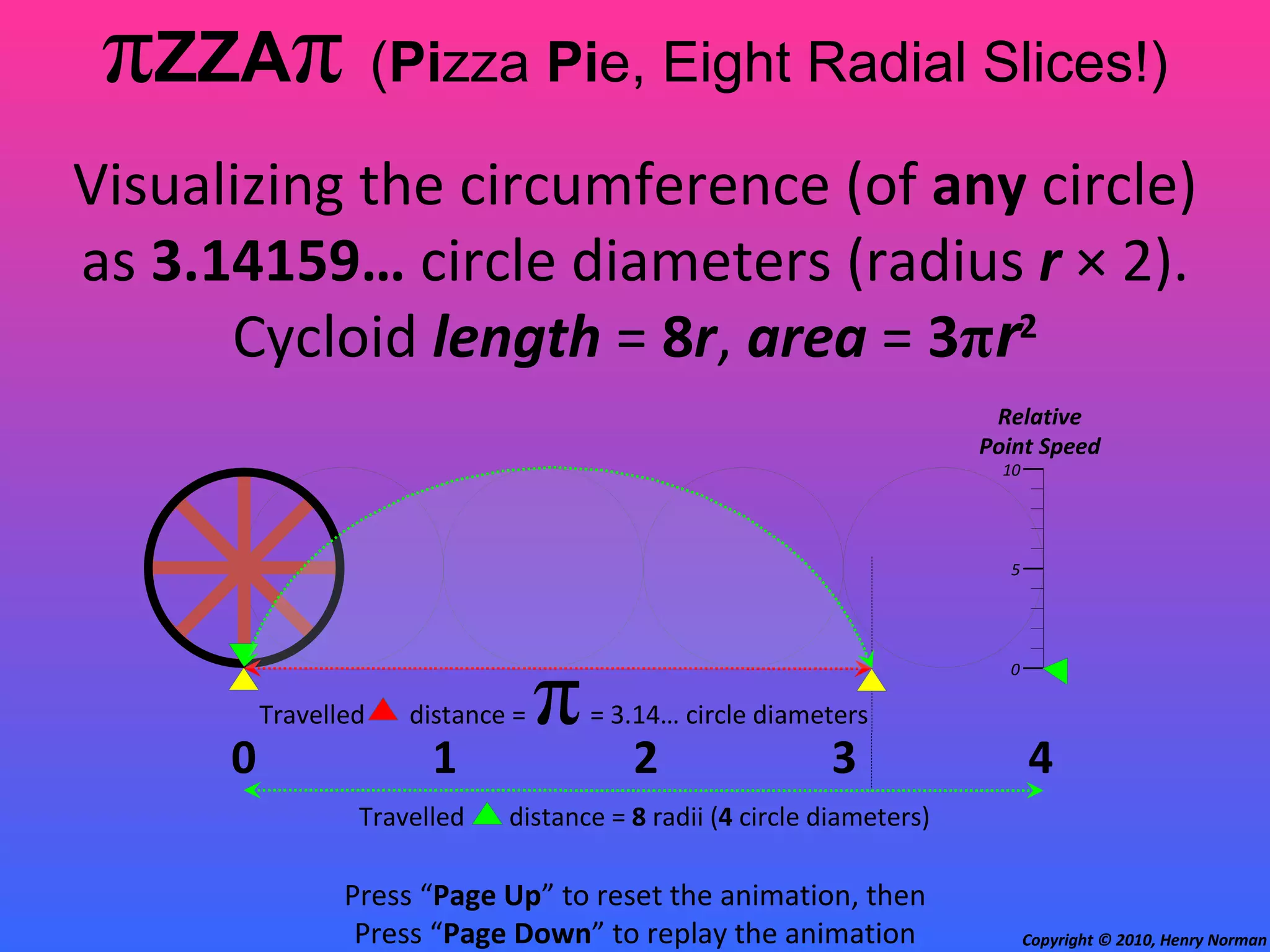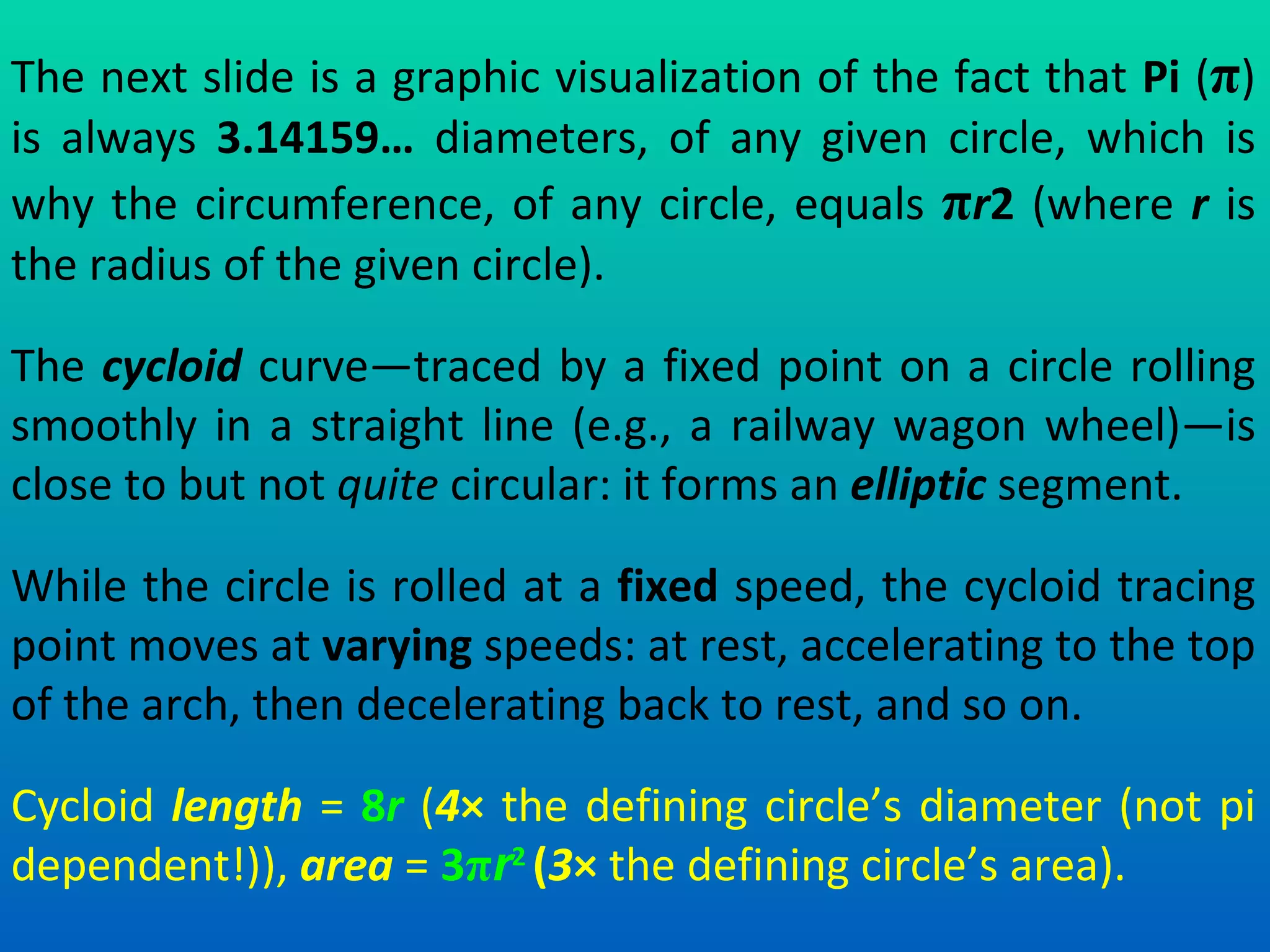 The document discusses the relationship between pi (π) and the circumference of circles. It states that the circumference of any circle equals π multiplied by its radius squared. It then explains that a cycloid curve, traced by a fixed point on a rolling circle, is close to but not quite circular, forming an elliptic segment. While the rolling circle moves at a fixed speed, the tracing point accelerates and decelerates, with its length equaling 8 times the radius and its area equaling 3 times pi multiplied by the radius squared.