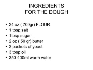 This document provides a recipe for pizza dough that includes 24 oz of flour, 1 tbsp each of salt and sugar, 2 oz of butter, 2 packets of yeast, 3 tbsp of oil, and 350-400ml of warm water. The directions say to mix the dry ingredients, then add the wet ingredients and mix to form dough, kneading it until smooth before shaping into balls and adding toppings to bake.