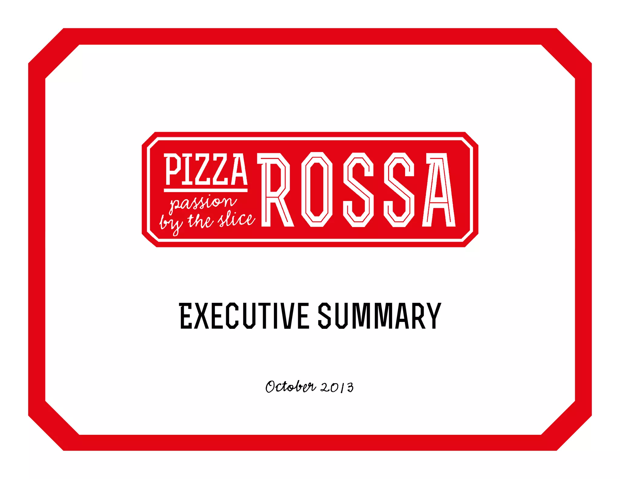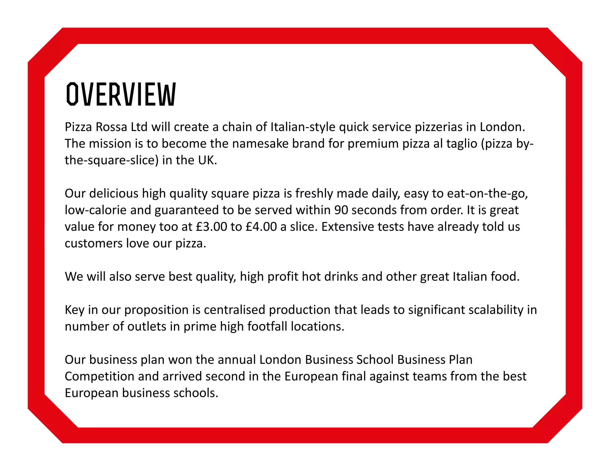 Pizza Rossa Ltd plans to establish a chain of Italian-style pizzerias in London, focusing on high-quality pizza al taglio served quickly and at an affordable price. The business model, which allows for centralized production and scalability, won competitions and is backed by significant customer testing. With a target market of time-constrained office workers and a goal of expanding to over 100 outlets, the company is seeking £430,000 in seed funding to launch its first locations and aims for explosive growth through franchising and potential exit strategies such as a trade sale.