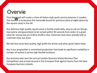 Pizza Rossa Ltd plans to establish a chain of quick-service pizzerias in London, specializing in premium Italian-style pizza al taglio served swiftly and at reasonable prices. The business model leverages centralized production to ensure scalability and efficiency, aiming to capture the time-constrained office worker demographic while competing with other fast food chains that do not offer pizza. The company seeks £430,000 in seed funding for initial expansion, with ambitious plans to grow to over 100 locations through franchising and partnerships.