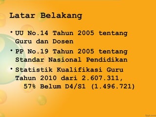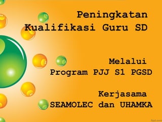 Program PJJ S1 PGSD kerjasama SEAMOLEC dan UHAMKA bertujuan meningkatkan kualifikasi guru SD dengan memberikan akses pendidikan S1 PGSD secara daring dan luring kepada guru SD lulusan D2 yang masih kurang kualifikasi. Program ini dirancang untuk lulusan 5 semester dengan biaya Rp10,5 juta dan persyaratan seperti ijazah, transkrip, pas foto, KTP, surat izin dari sekolah dan BKD.