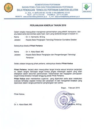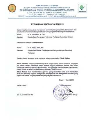 1. Perjanjian kinerja tahun 2016 antara Kepala Balai Pengkajian Teknologi Pertanian Sumatera Selatan dan atasannya untuk mencapai target kinerja meliputi pengembangan teknologi, diseminasi, dan dukungan pengkajian.