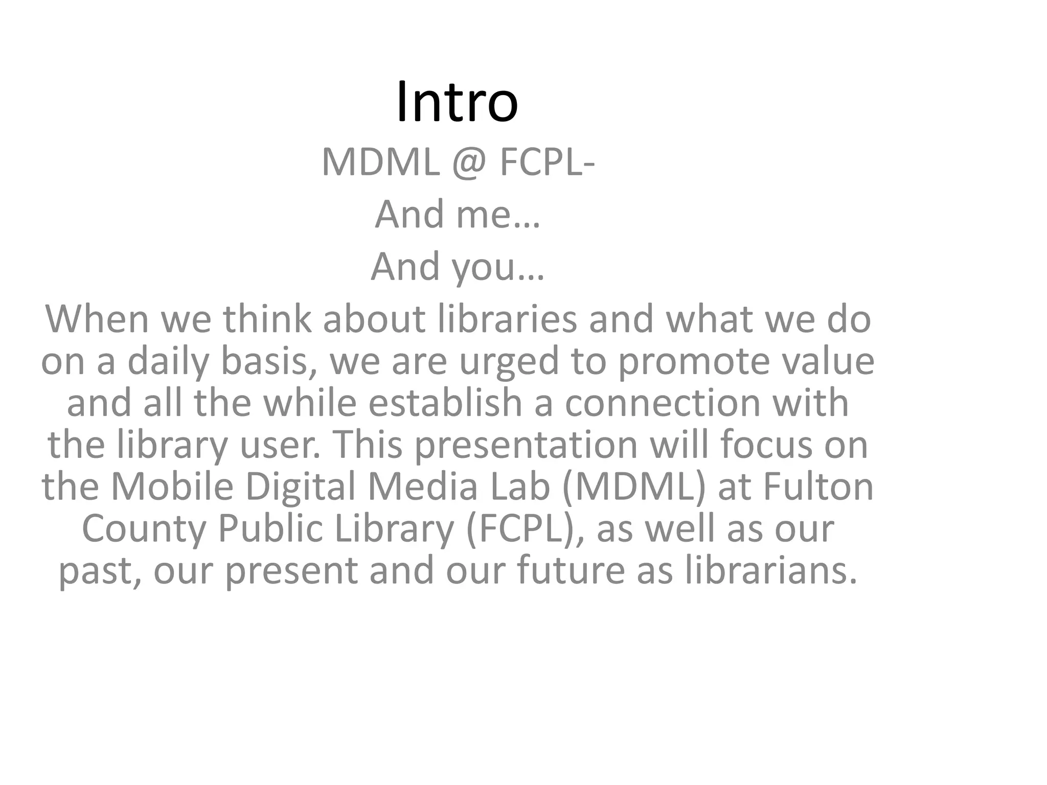 The document summarizes the Mobile Digital Media Lab (MDML) at the Fulton County Public Library (FCPL). It describes how the MDML was created to serve the library's largely rural population by taking technology and media classes directly to patrons. It provides an overview of the MDML's history and services, from its origins in a grant-funded project to its current weekly classes and outreach efforts. It envisions expanding the MDML's reach through additional community and business partnerships to promote creativity, collaboration, and digital literacy.