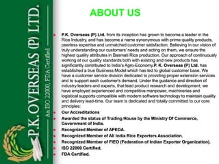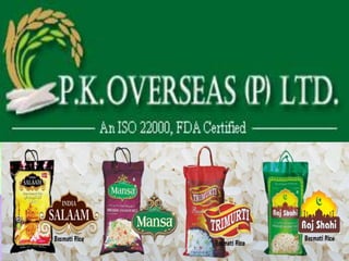 P.K. Overseas (P) Ltd. has established itself as a leader in the rice industry by focusing on quality and customer satisfaction, contributing significantly to India's agro-economy. The company is recognized for its commitment to quality standards, supported by a dedicated customer service division and experienced workforce. It holds multiple accreditations including ISO 22000 and recognition from various trade organizations.