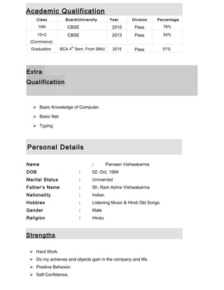 Parveen Vishwakarma is seeking a challenging position that provides career growth. He has 6 months of experience as a data entry operator for Dahiya Enterprise and currently works as an e-commerce executive for Sneha Unique Footwear. He completed his 10th and 12th exams through CBSE and is pursuing his BCA degree. His strengths include hard work, positive behavior, and self-confidence.