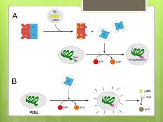 Protein kinase A (PKA) is an enzyme involved in the cAMP-dependent pathway. It is activated when cyclic AMP (cAMP) levels rise in response to stimuli like hormones or neurotransmitters. PKA then directly phosphorylates other proteins to regulate various cellular processes either rapidly through direct phosphorylation or slowly through activating transcription factors. PKA activity is regulated by anchoring proteins and feedback loops, and it functions in many tissues to modulate processes like metabolism, ion transport, gene expression, and more.