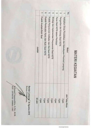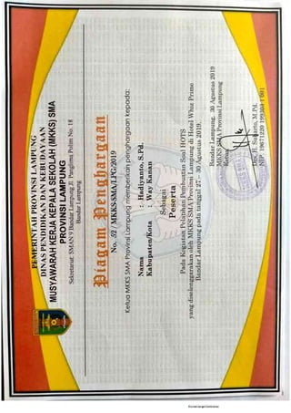 Laporan ini merangkum laporan kegiatan pengembangan diri penulis melalui kegiatan pelatihan dan diklat sejak tahun 2018 hingga 2020. Kegiatan tersebut meliputi (1) In House Training Kurikulum 2013 Revisi 2018 SMAN 1 Gunung Labuhan, (2) Pelatihan Pembuatan Soal HOTS, (3) Pelatihan Pembuatan Soal Online Menggunakan Quizizz, (4) Pelatihan Pembuatan Blog Pembelajaran, (5) Pelatihan Design Poster Pendidikan, dan (