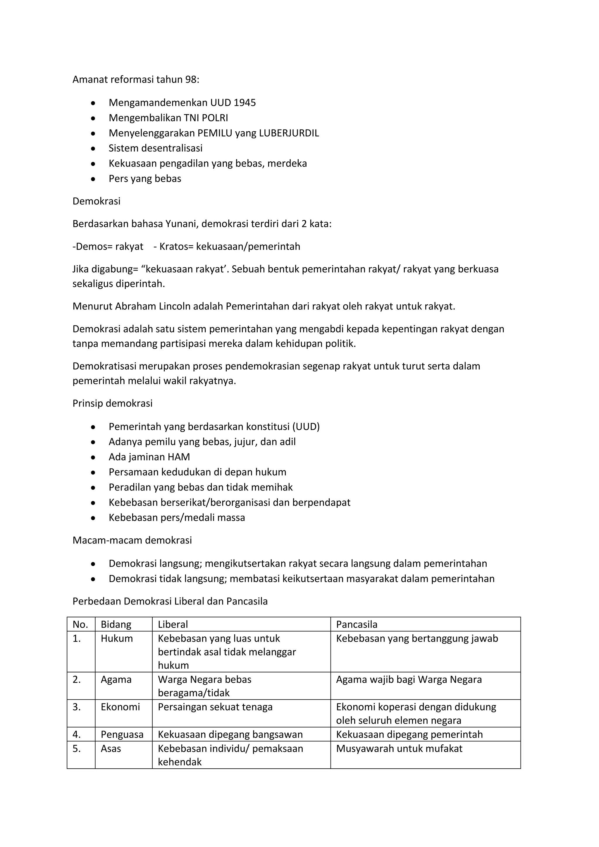 Dokumen ini menjelaskan amanat reformasi tahun 1998 yang mencakup amandemen UUD 1945, pemulihan TNI-Polri, dan penyelenggaraan pemilu yang bebas serta jujur. Dijelaskan juga mengenai prinsip-prinsip demokrasi, perbedaan antara demokrasi liberal dan Pancasila, serta perkembangan demokrasi di Indonesia dari tahun 1945 hingga sekarang. Demokrasi Pancasila menekankan pada pemerintahan yang mengabdi kepada kepentingan rakyat dengan prinsip musyawarah untuk mufakat.