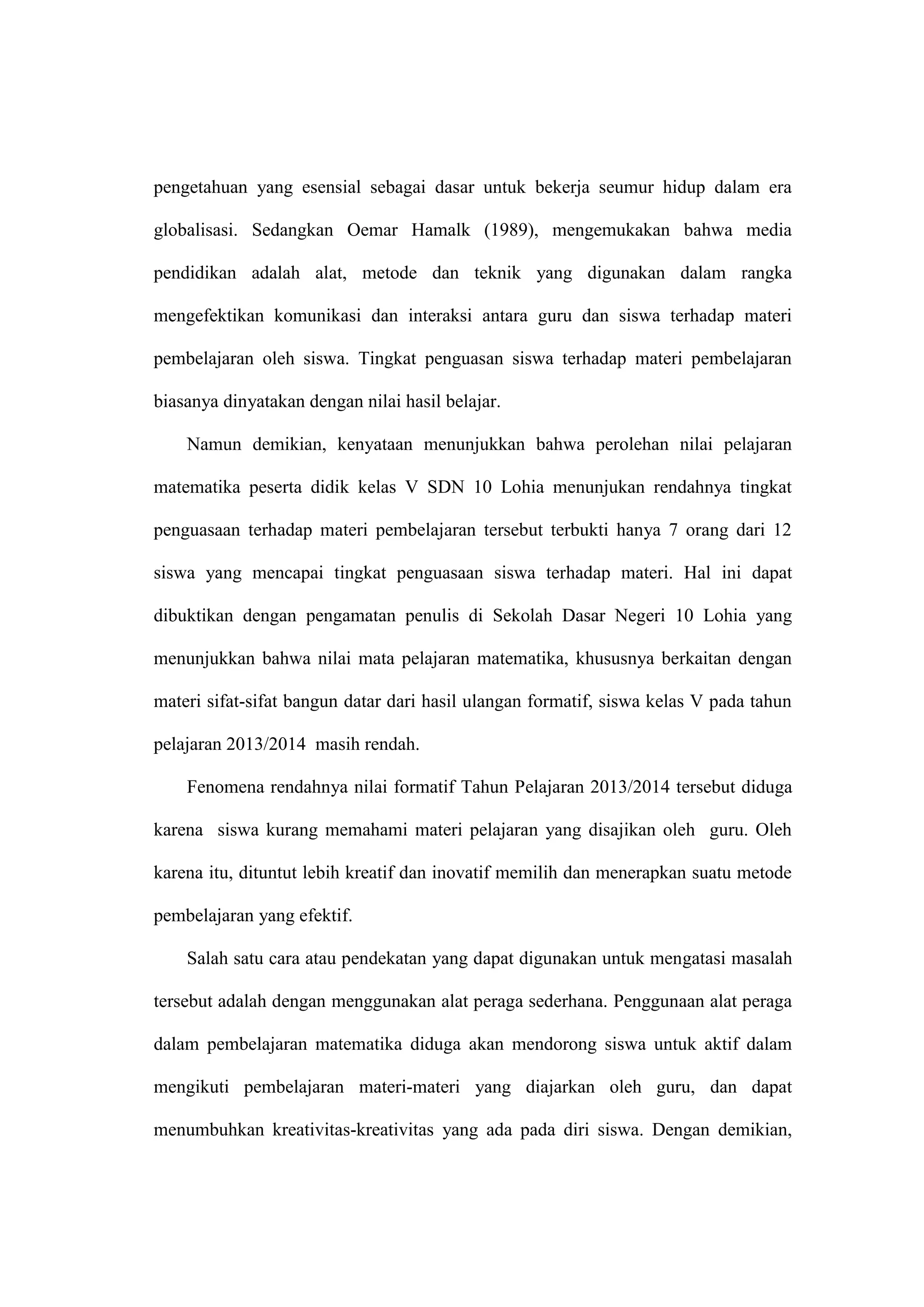 Dokumen ini membahas pentingnya peningkatan kualitas pembelajaran matematika di SD, khususnya melalui penggunaan alat peraga untuk memahami materi sifat-sifat bangun datar. Penelitian ini bertujuan untuk meningkatkan hasil belajar siswa kelas V SD Negeri 10 Lohias dengan menerapkan metode pembelajaran yang lebih kreatif dan inovatif. Hasil yang diharapkan adalah peningkatan pemahaman siswa terhadap matematika dan perbaikan kinerja guru dalam pengajaran.