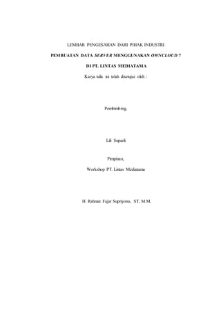 Laporan ini membahas pembuatan data server menggunakan Owncloud 7 di PT. Lintas Mediatama Bandung untuk memenuhi syarat kelulusan dari SMK Negeri 1 Cimahi. Pembuatan data server ini dilakukan untuk menyediakan penyimpanan data lokal yang lebih menguntungkan dibandingkan sewa tempat penyimpanan data.