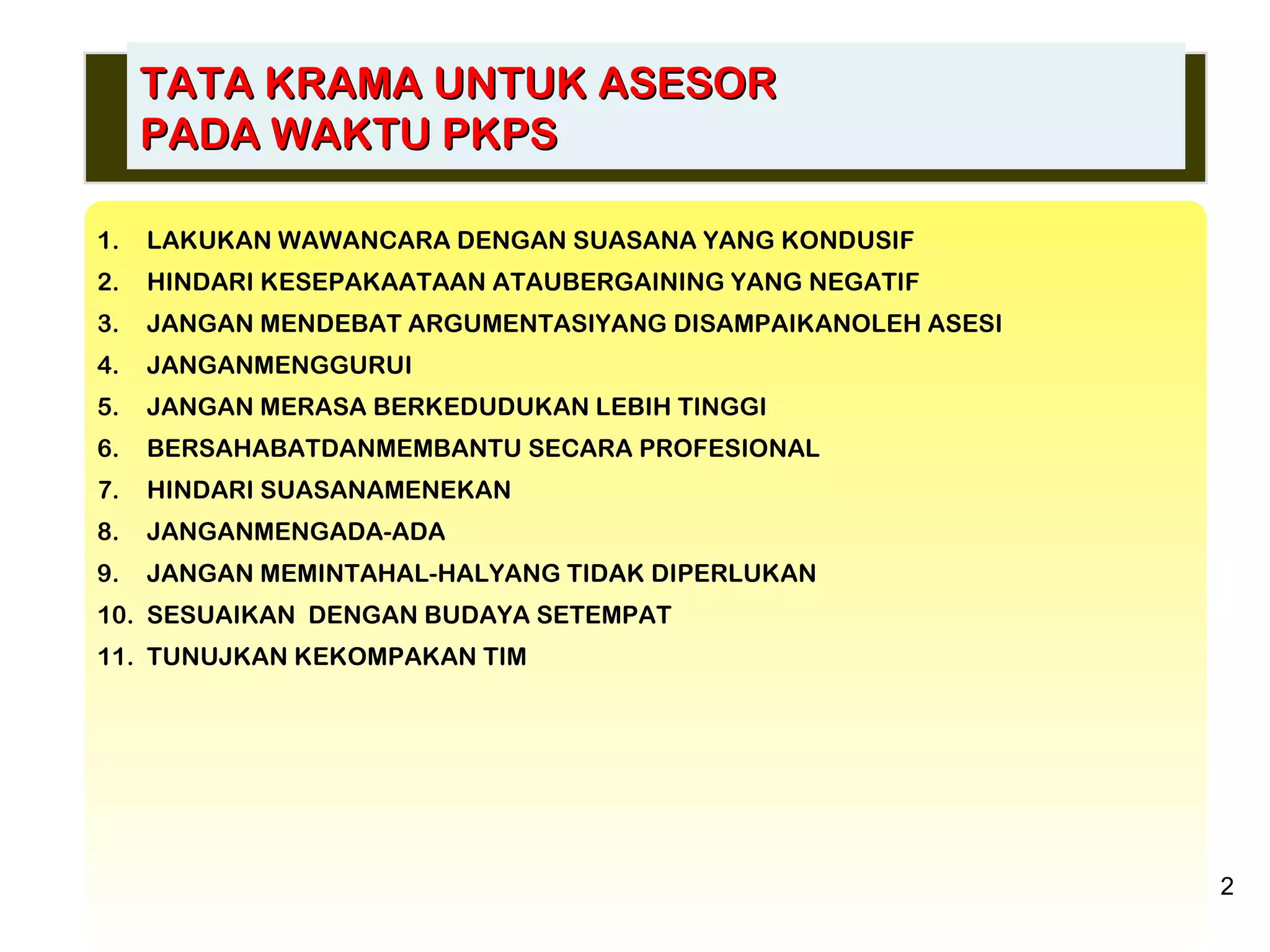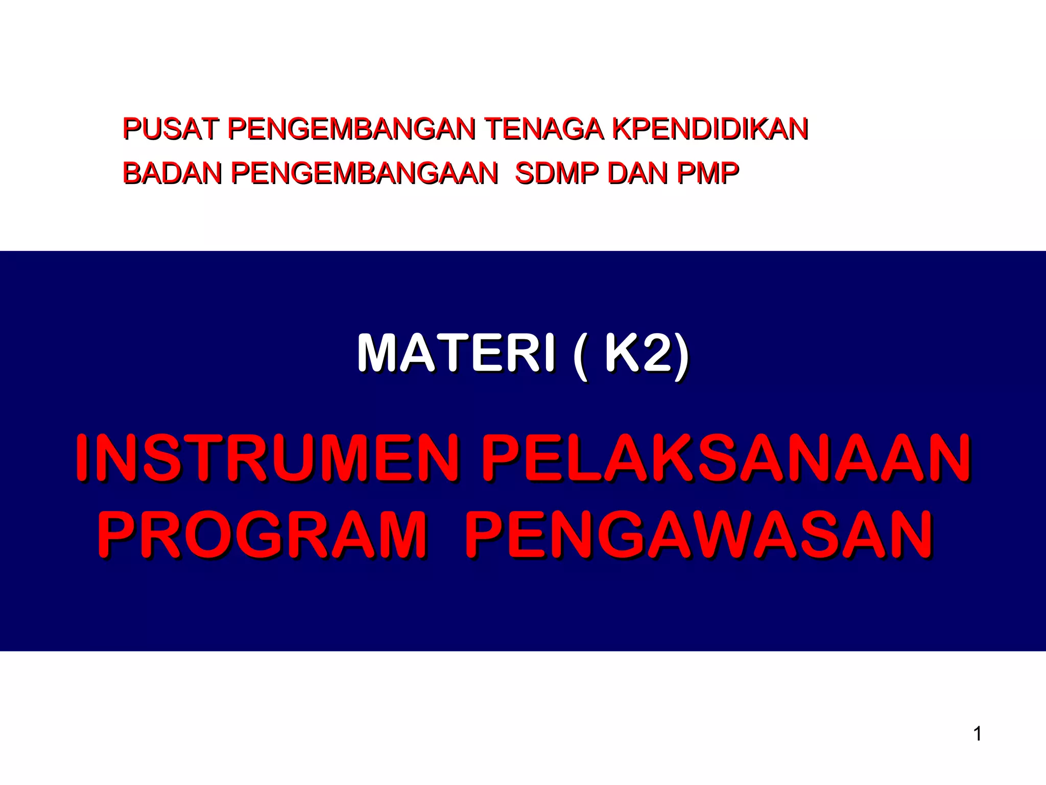 Dokumen tersebut membahas tentang instrumen pelaksanaan program pengawasan pusat pengembangan tenaga kependidikan yang mencakup tata tertib dan tata krama untuk asesor dalam melakukan pengawasan, pembinaan guru, kepala sekolah, pemantauan standar nasional pendidikan, serta penilaian kinerja guru dan kepala sekolah.