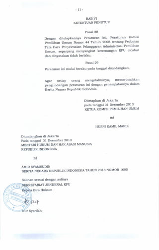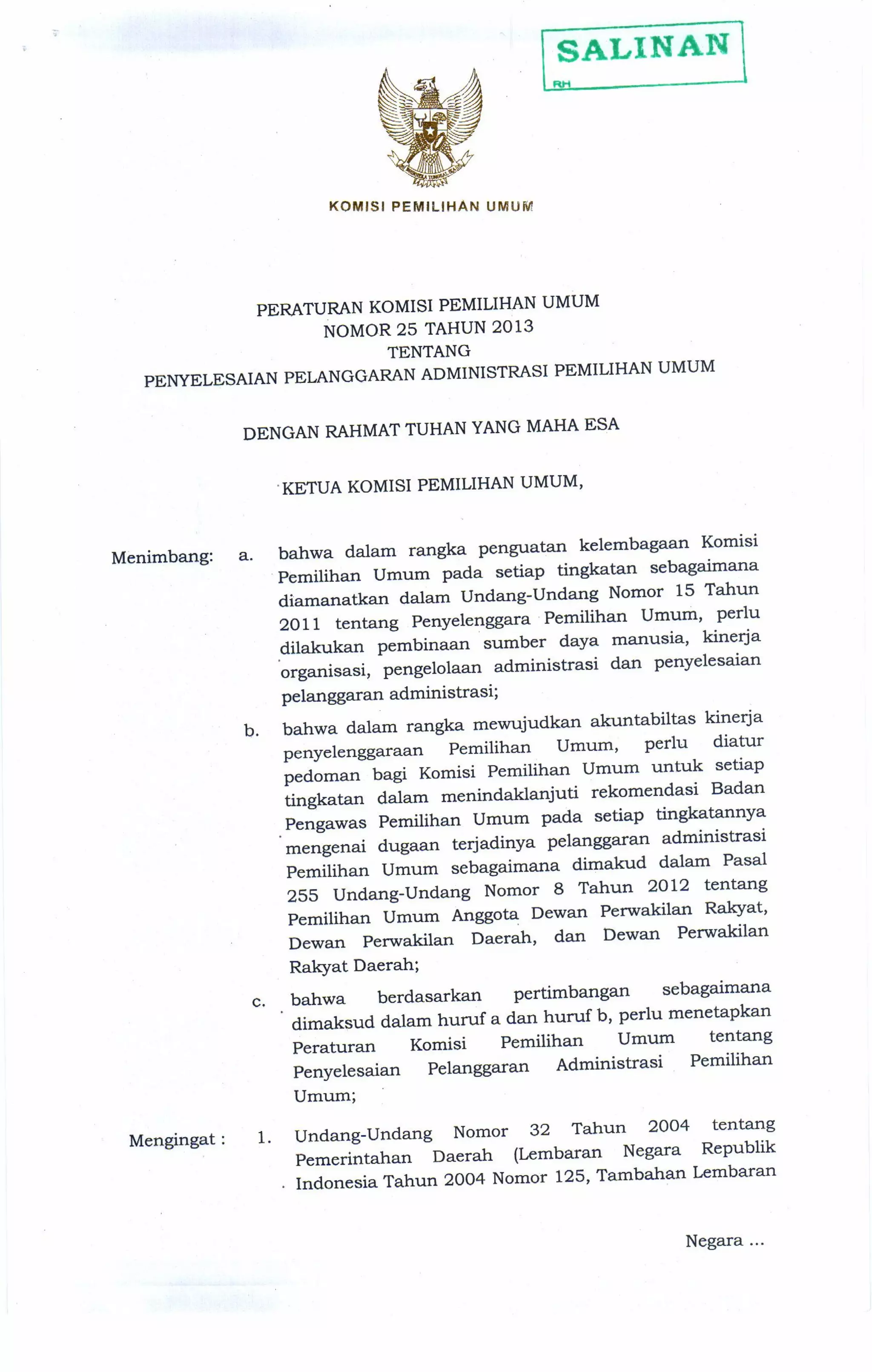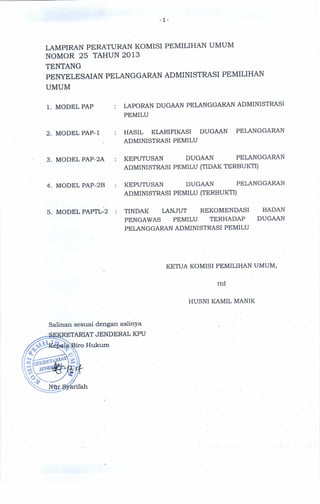 Dokumen ini berisi peraturan tentang penyelesaian pelanggaran administrasi pemilihan umum di Indonesia, termasuk ketentuan umum, kategori pelanggaran, dan mekanisme penyelesaian. Komisi pemilihan umum memiliki tanggung jawab untuk menangani pelanggaran dan memastikan proses pemilu dilaksanakan secara adil dan transparan. Sanksi terhadap pelanggaran diatur dengan tegas untuk memastikan kepatuhan terhadap prosedur yang ditetapkan.