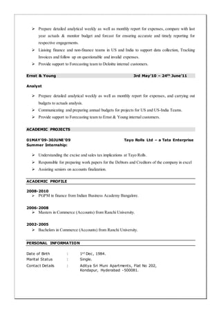 Praveen Kumar Sharma is a finance and accounting professional with over 5 years of experience in financial reporting, revenue recognition, and forecasting for businesses with annual revenues in the billions. He has worked as a senior consultant at Deloitte since 2011 where he prepares analytical reports, monitors budgets and expenses, and supports forecasting teams. Prior to Deloitte, he worked as an analyst at Ernst & Young from 2010 to 2011 where he also prepared reports, budgets, forecasts, and provided support to internal customers.