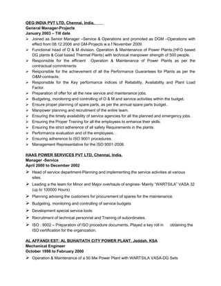 P.K. Vasanth is a mechanical engineer with over 30 years of experience in operation and maintenance of power plants. He is currently a General Manager of Projects at OEG India Pvt Ltd, where he oversees a team of 500 people and is responsible for efficient plant operation and maintenance. Previously, he has held managerial roles overseeing service departments and has extensive experience working with engines from Wartsila, Cummins, and other manufacturers. He is seeking a challenging new career opportunity where he can contribute to organizational success with his technical and leadership skills.