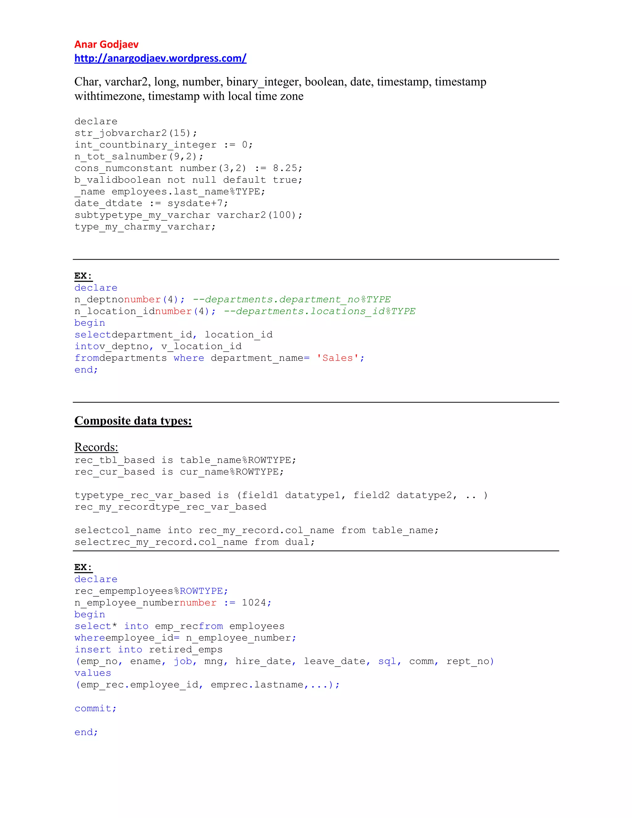 1. PL/SQL blocks allow declaring variables, cursors, and exceptions before executing SQL and PL/SQL statements. Variables can be scalar, composite like records, or reference types like cursors.