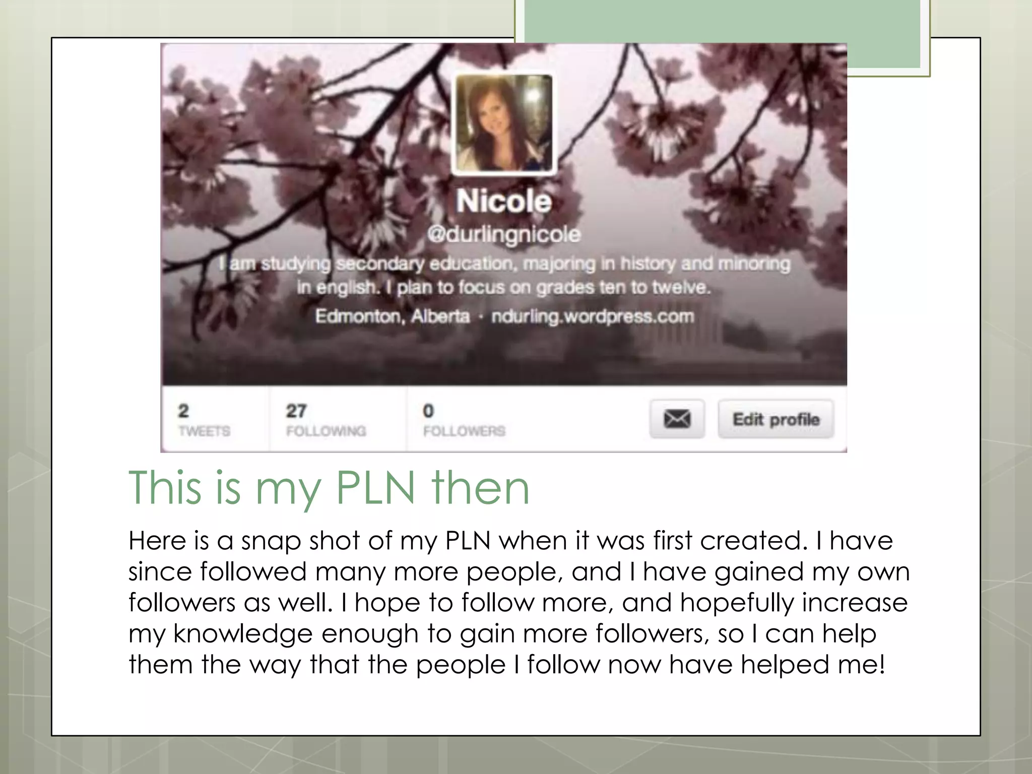 This document summarizes the professional learning network (PLN) that Nicole Durling has created. It provides snapshots of her initial PLN when first created, as well as her current PLN. Her PLN now includes following more accounts, gaining her own followers, and sharing her own tweets on education and teaching methods. Building her PLN has connected her to resources, tools, and professionals that will aid her continued professional development as a teacher.