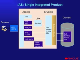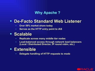 The document discusses the architecture and components used to serve web requests in Oracle Application Server. Apache is used as the web listener and supports modules like mod_plsql and mod_jserv. Mod_plsql allows generating dynamic HTML from PL/SQL code directly in the database. Mod_jserv runs Java servlets and JSPs. The web request flows from the client to the Apache listener, then to authentication modules, before being routed to mod_plsql, mod_jserv or backend databases to generate and return dynamic content to the client.