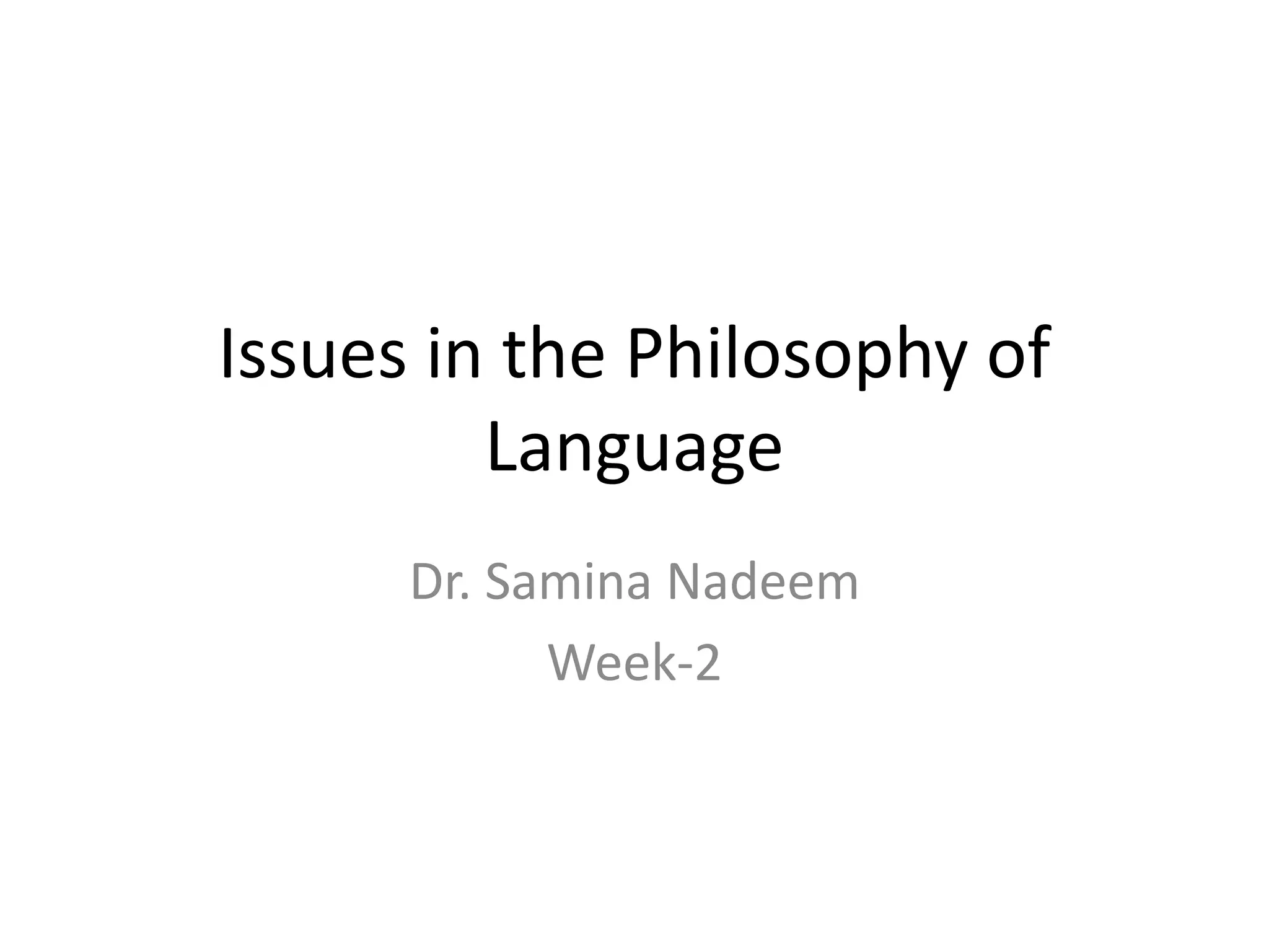 This document discusses several key issues in the philosophy of language over multiple pages. It covers topics like meaning skepticism, vagueness, reference, translation, interpretation, and more. It provides overview explanations of these concepts with examples and references the works of thinkers like Frege, Russell, Quine, Wittgenstein, and others. It also includes short summaries of the views of different philosophers on specific issues like reference, proper names, and vagueness.