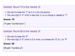Rounding means reducing the digits in a number while keeping its value similar but easier to use. To round, decide which is the last digit to keep, leave it the same if the next digit is less than 5, or increase it by 1 if the next digit is 5 or more. Examples show rounding numbers to different decimal places like hundredths or tenths. Practice problems apply rounding to whole numbers, decimals, and fractions converted to decimals.