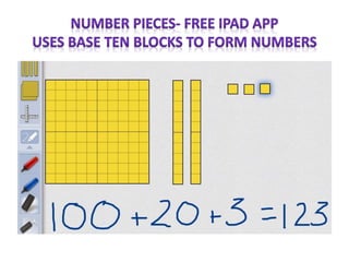 The document discusses using technology to teach place value in elementary school. It notes that technology provides new engaging ways for teachers to work with students and multiple avenues to reinforce place value concepts. Several online games and websites are recommended that allow formative assessment of student understanding. Videos, instructional materials, and interactive games on sites like Khan Academy and ABCya are highlighted as quality digital resources for teaching place value.