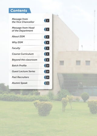 This document provides information about the Delhi School of Management (DSM) MBA program. It includes messages from the Vice Chancellor and Head of Department welcoming the new batch of students. It outlines the DSM's faculty, rigorous course curriculum with technical and functional specializations, and opportunities for students beyond the classroom through various clubs and events. These include an annual management conclave, a sports event called Horizon 1.0, an advertising competition called Ad Mad Show, and a virtual stock trading competition called Wall Street. The document promotes the strengths of the DSM program in developing techno-managers through dual specializations, high-caliber students and faculty, and experiential learning opportunities.