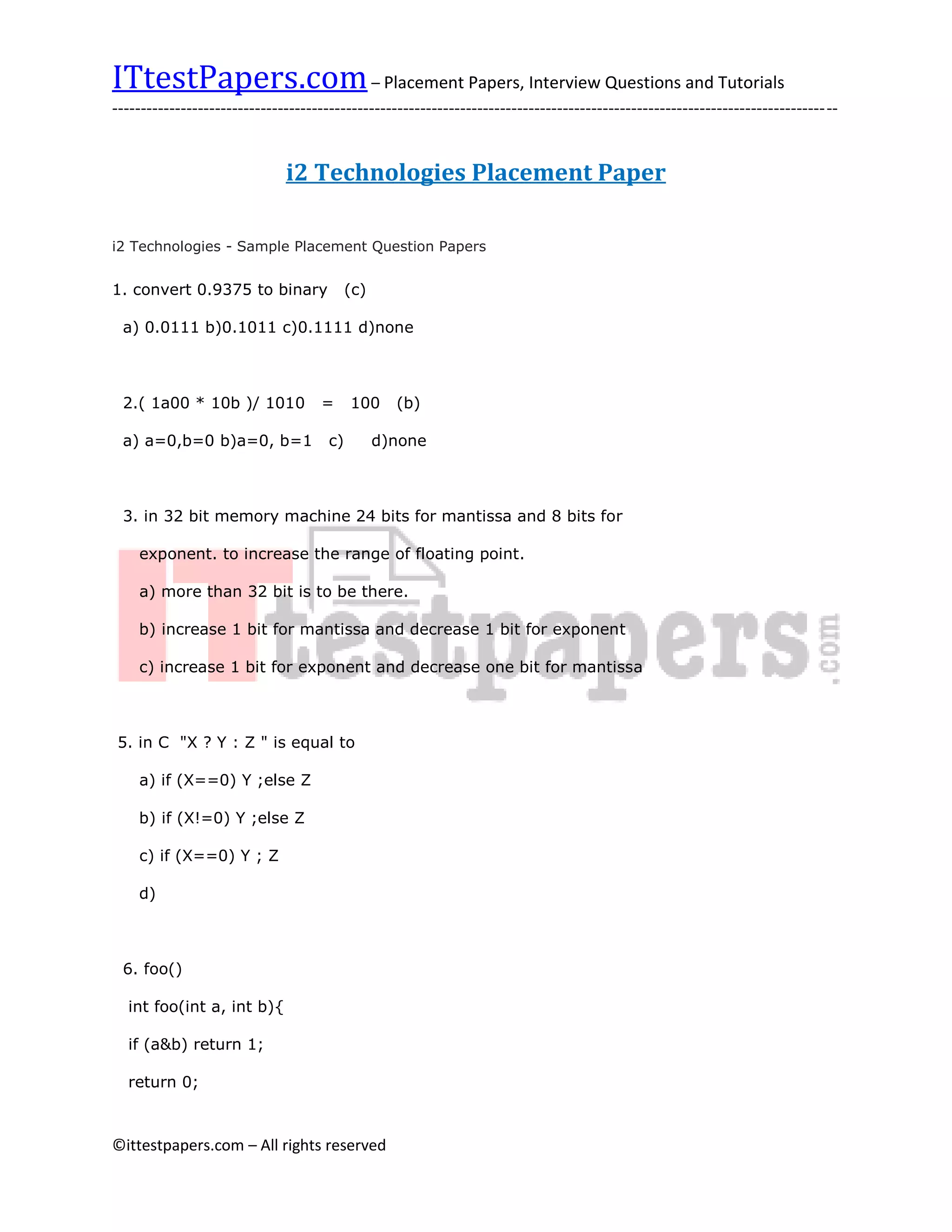This document provides sample placement questions from i2 Technologies along with their solutions. It also describes a sample problem about merging two schools with different number of classes and sections into a new school while keeping students of the same class and section together. Finally, it provides links to download additional placement papers and interview questions from other companies on the ITtestPapers website.