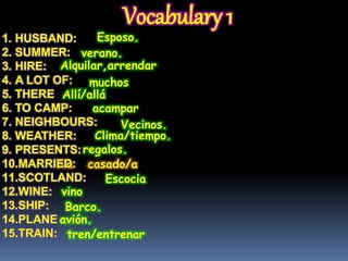 The document provides a list of vocabulary words in Spanish with their English translations. It includes common nouns like "town", "job", and "weather" as well as verbs like "to want", "to smoke", and "to camp". There are also some prepositions and phrases translated like "there", "only", and "married". The vocabulary is organized into different sections with topics including people, places, activities, and daily life.
