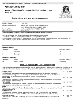 1) This document is an assessment report for Julia Cirillo, a student teacher completing her professional practice and seminar 1 at the Master of Teaching (Secondary) course.