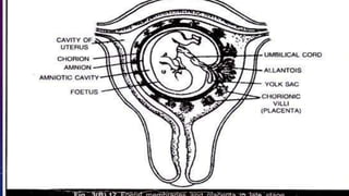 The placenta forms between the developing embryo and the uterine wall of the mother, consisting of finger-like projections called chorionic villi that are surrounded by uterine tissue and maternal blood. It facilitates the supply of oxygen and nutrients to the embryo while removing carbon dioxide and waste via the umbilical cord, and also acts as an endocrine tissue producing important hormones for the pregnancy.