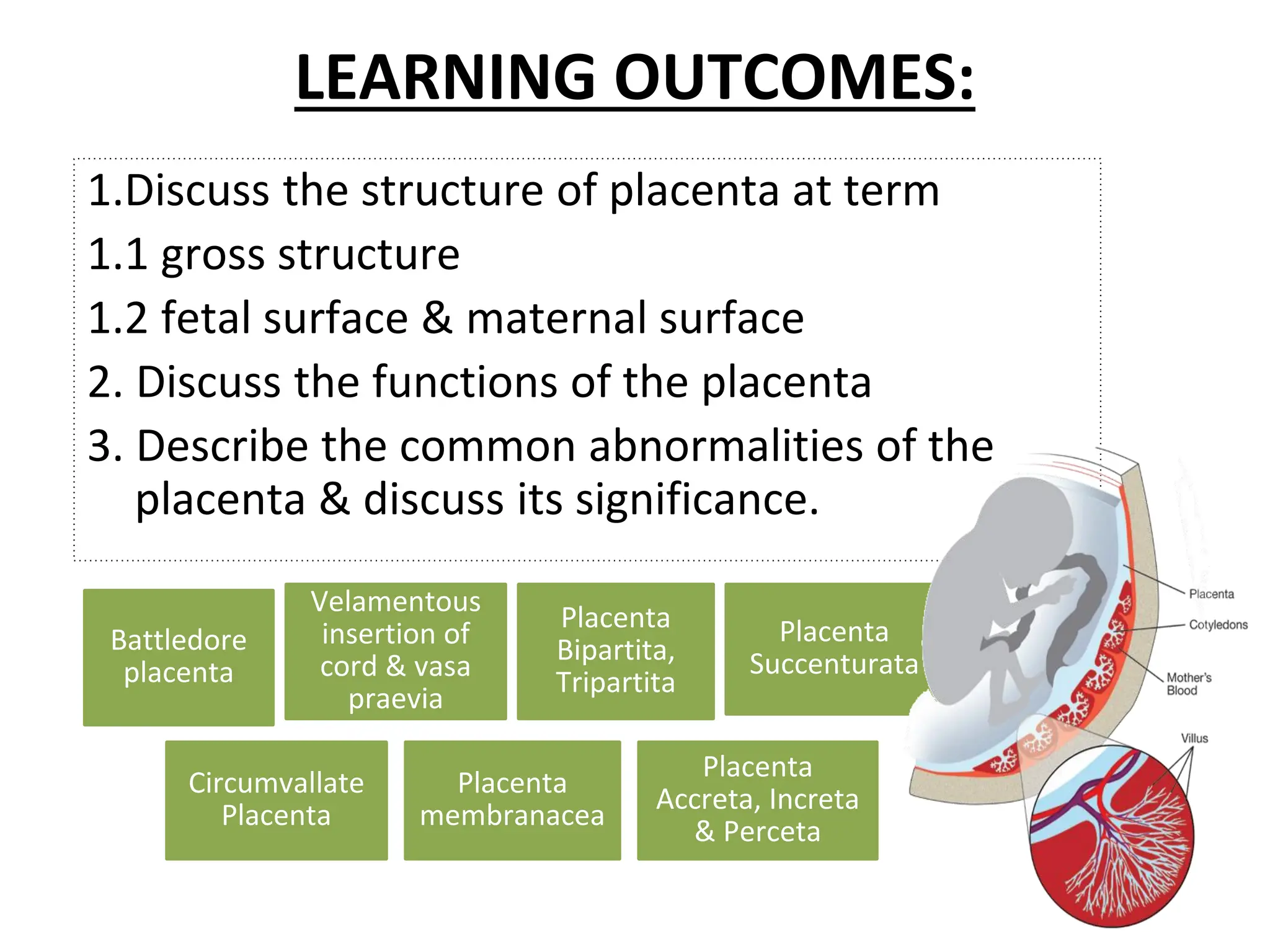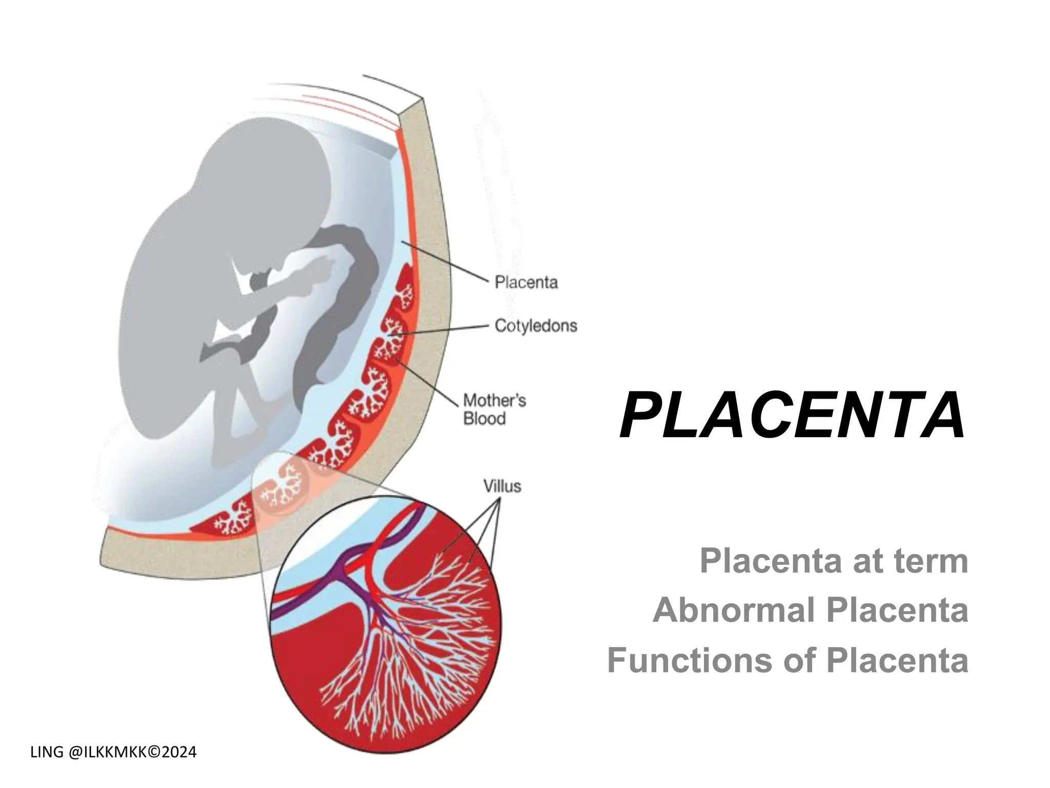 The document discusses the structure and functions of the placenta at term, detailing its gross structure, including the fetal and maternal surfaces, and common abnormalities such as placenta accreta and velamentous insertion. It highlights the placenta's roles in nutrition, respiration, excretion, immunity, drug transport, storage, and hormone secretion. Additionally, it outlines potential dangers posed by abnormalities and various conditions affecting the placenta.