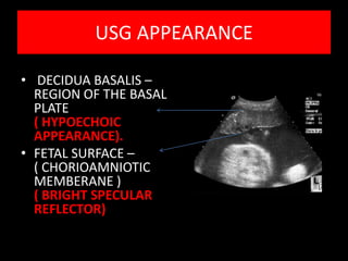 This document provides information on placental grading and ultrasound appearance of the placenta. It describes the four grades of placental maturity based on ultrasound findings. Grade 0 is seen in the first trimester and is characterized by a smooth echopattern. Grades 1-3 are seen later in pregnancy and are distinguished by the presence and pattern of calcifications. Abnormal placenta features like circumvallate, succenturiate lobe, and membranous placentas are also described. The document concludes with descriptions of twinning ultrasound signs and examples of placental hematomas.