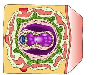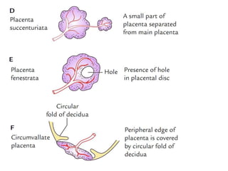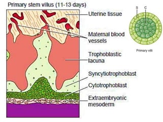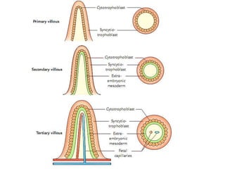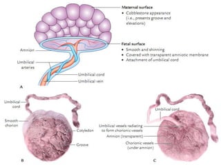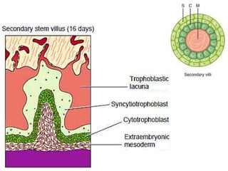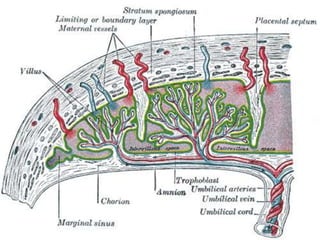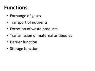 The placenta functions to exchange gases, transport nutrients and waste, and transmit antibodies between the mother and fetus. It is formed from fetal membranes originating from the fertilized ovum. The placenta has a dual origin from the fetal chorion and maternal decidua basalis. Chorionic villi invade the endometrium and develop into stem villi that anchor the placenta and give rise to branching terminal villi for main nutrient exchange with the maternal blood in the intervillous spaces. The placenta develops lobes and circulates both maternal and fetal blood to facilitate transfer between the two.