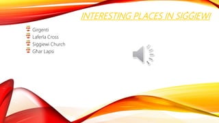 This document provides information about interesting places to visit in Siġġiewi, Malta. It describes Girgenti Palace, built in 1625 by Inquisitor Onorto Visconti, which offers impressive views of the countryside and gardens. Ghar Lapsi, a rocky beach close to Siġġiewi village, is popular for swimming and enjoying the scenery. The Laferla Cross memorial was constructed in 1903 under Gianni Mercieca to honor Fr Paul Laferla. Finally, the Siggiewi Church sits in the heart of the village near a statue of Saint Nicholas, and features beautiful architecture on its walls.