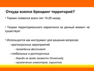 Документ обсуждает концепцию брендинга территорий, возникшую за последние 15-20 лет, и её использование для привлечения инвестиций и туристов, а также для социальной и экономической активности. Основные инструменты брендинга включают символику, музыкальные и культурные элементы, а также крупные события. Упоминаются примеры городов с сильными ассоциациями, подчеркивая важность брендинга для формирования положительного имиджа территории.