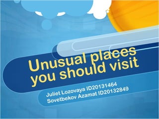 The document provides an outline and overview of 6 unique locations around the world: Leshan Giant Buddha in China, Aogashima volcano island in Japan, Sea Glass Beach in California, the Northern Lights phenomenon in Iceland, the ancient Maya civilization in Mexico and Central America, and the Naica Mine cave in Mexico known for its giant selenite crystals. It describes notable features, histories and facts about each location. The document concludes by asking readers questions about details from the descriptions to check their understanding.