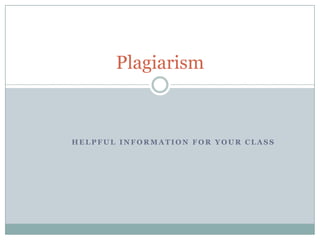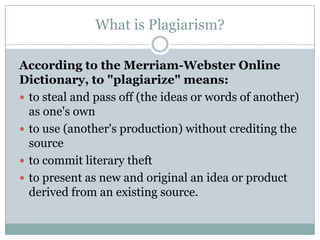 Plagiarism involves presenting another's work as one's own without proper citation or credit. It includes copying words or ideas without attribution, failing to put quotations in quotation marks, and presenting someone else's work as original. Studies show that plagiarism is common, with around 80% of college students admitting to cheating and 36% admitting to plagiarism specifically. Many students also believe plagiarists are unlikely to face consequences.