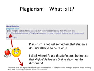 The document discusses plagiarism, defining it as passing off another's work as one's own without proper citation or attribution. It provides examples of situations that would and would not constitute plagiarism, such as turning in a purchased paper, copying and pasting a paragraph without quotation marks or citation, or reusing one's own past work without permission. The key ways to avoid plagiarism are properly citing any ideas, quotes, or facts taken from outside sources. Academic dishonesty, such as fabricating sources in a bibliography, should also be avoided.