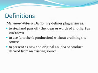 This document defines plagiarism and discusses its consequences. Plagiarism is defined as passing off another's work as one's own without crediting the source. The document outlines both intentional and unintentional plagiarism. It also discusses common knowledge, paraphrasing, and provides examples. Consequences of plagiarism include penalties from instructors like failing grades or disciplinary action. Research tips are provided to avoid plagiarism like knowing citation styles and giving proper credit.