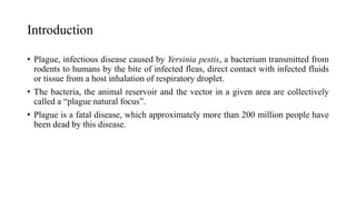 Purshotam Kumar Sah Kanu's document provides an overview of plague caused by the Yersinia pestis bacterium. Some key points: