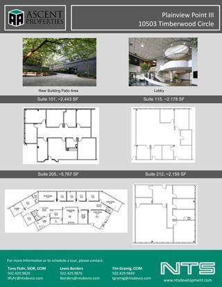 Plainview Point III is a leasing opportunity located at 10503 Timber Wood Circle, offering approximately 62,000 square feet of office space across three floors. The building features a reflective glass exterior, a campus setting with outdoor amenities, and is conveniently located near major highways and the Louisville airport. Interested parties can contact NTS Development Company for more information or to schedule a tour.