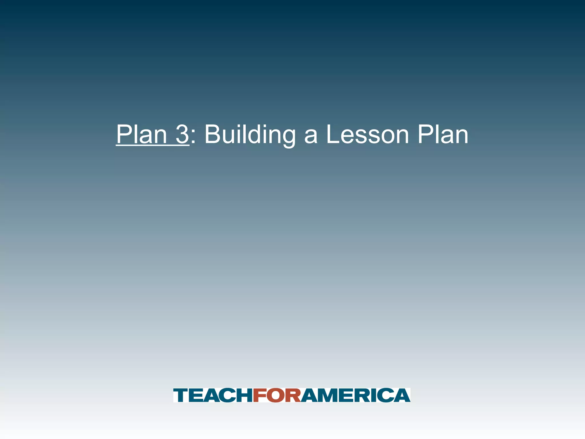 The document provides guidance for writing an effective lesson plan using backwards planning. It discusses three key principles: 1) All instruction should be driven by the objective-aligned vision, 2) The sequence of methods should gradually release responsibility from the teacher to the student using "I do, We do, You do", and 3) Lesson methods should be backwards planned to keep the end goal in mind and ensure a seamless flow between components. It evaluates a sample lesson plan against these principles and identifies areas for improvement.