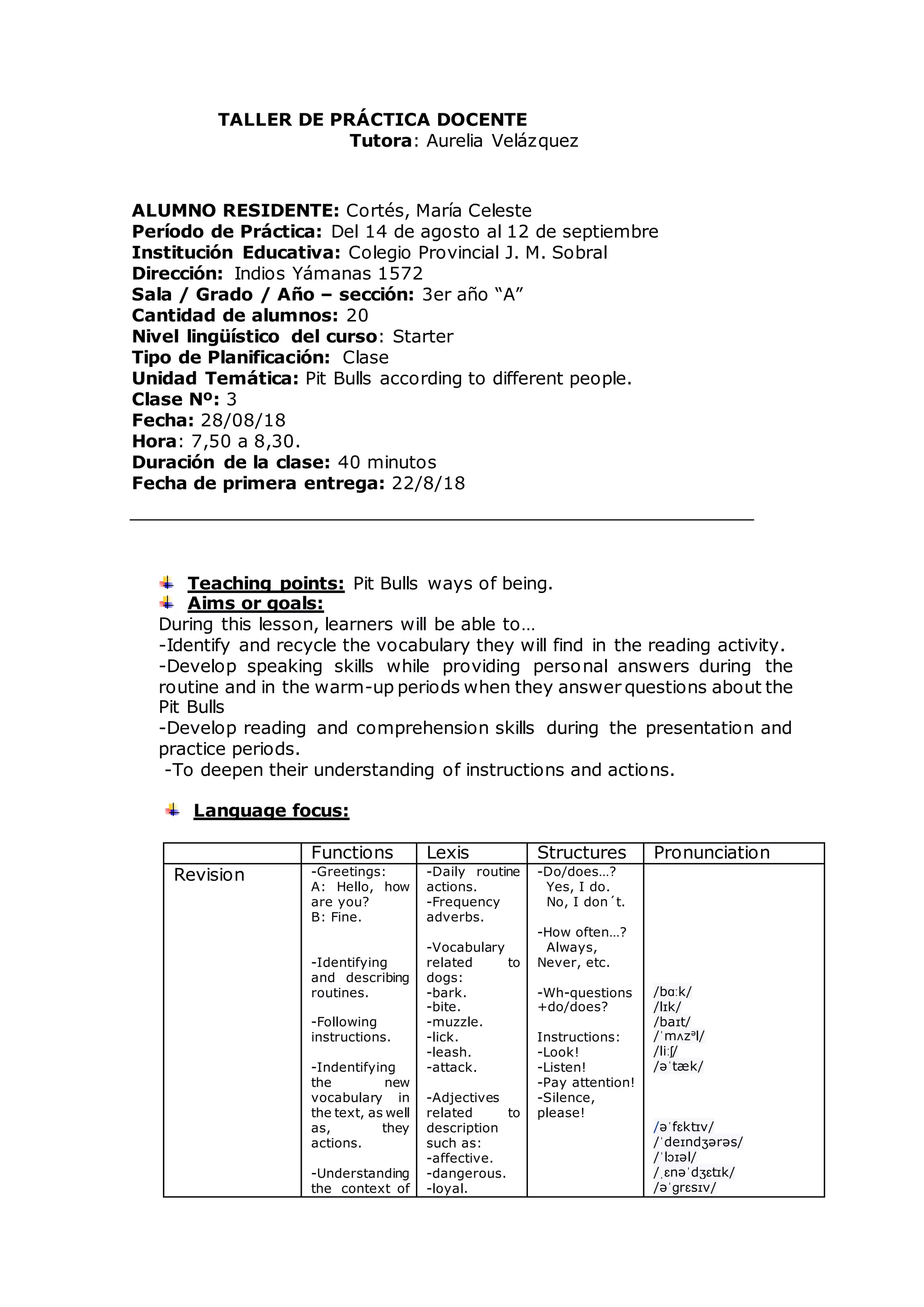 This document summarizes a lesson plan for a third year English class at Colegio Provincial J.M. Sobral. The 40-minute lesson focuses on pit bulls and aims to develop students' vocabulary, reading, speaking, and writing skills. It includes routines, warm-up activities reviewing pit bull vocabulary, a reading activity about pit bulls with comprehension questions, and a closing game to reinforce the language. The teacher assesses students' skills throughout the lesson and the plan details potential issues and solutions.