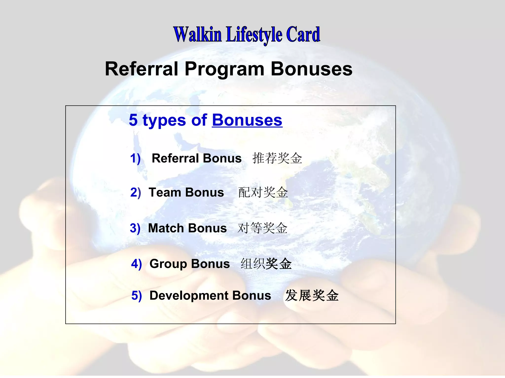 The document discusses the various bonus structures for a multi-level marketing referral program. It outlines 5 types of bonuses: 1) Referral Bonus, 2) Team Bonus, 3) Match Bonus, 4) Group Bonus, and 5) Development Bonus. It provides the payout amounts and qualification levels for each bonus type based on the member's ranking as an e-Member, Silver, Gold, or Platinum.