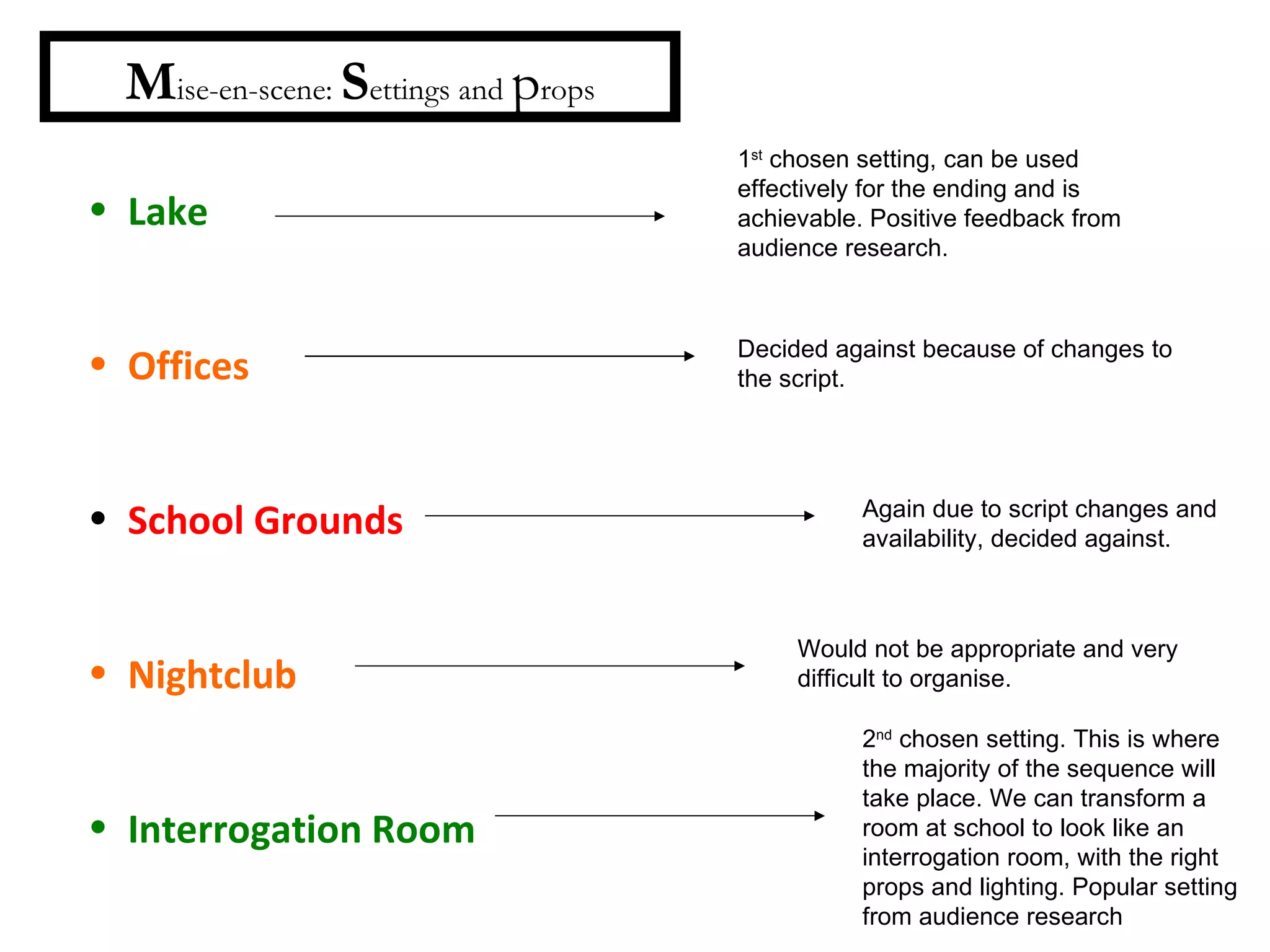 The document discusses the mise-en-scene choices for a film sequence, including settings, costumes, makeup, lighting, characters, and sound. The interrogation room setting was popular but changes to the script ruled it out. Costumes will distinguish the homeless suspect from detectives in suits. Low key lighting and a blue-filtered lamp will create suspense. Music will set an eerie atmosphere without overwhelming dialogue.