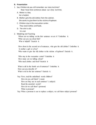 This lesson plan teaches students about personal pronouns like subject pronouns. It includes activities like a cabbage relay to review nouns and identify subjects in sentences. Students will then read and analyze sentences using subject pronouns like he, she, it and they to replace nouns. They will practice this through group activities like rearranging words and matching pictures to phrases. The lesson aims to help students properly use subject pronouns in writing and speaking.