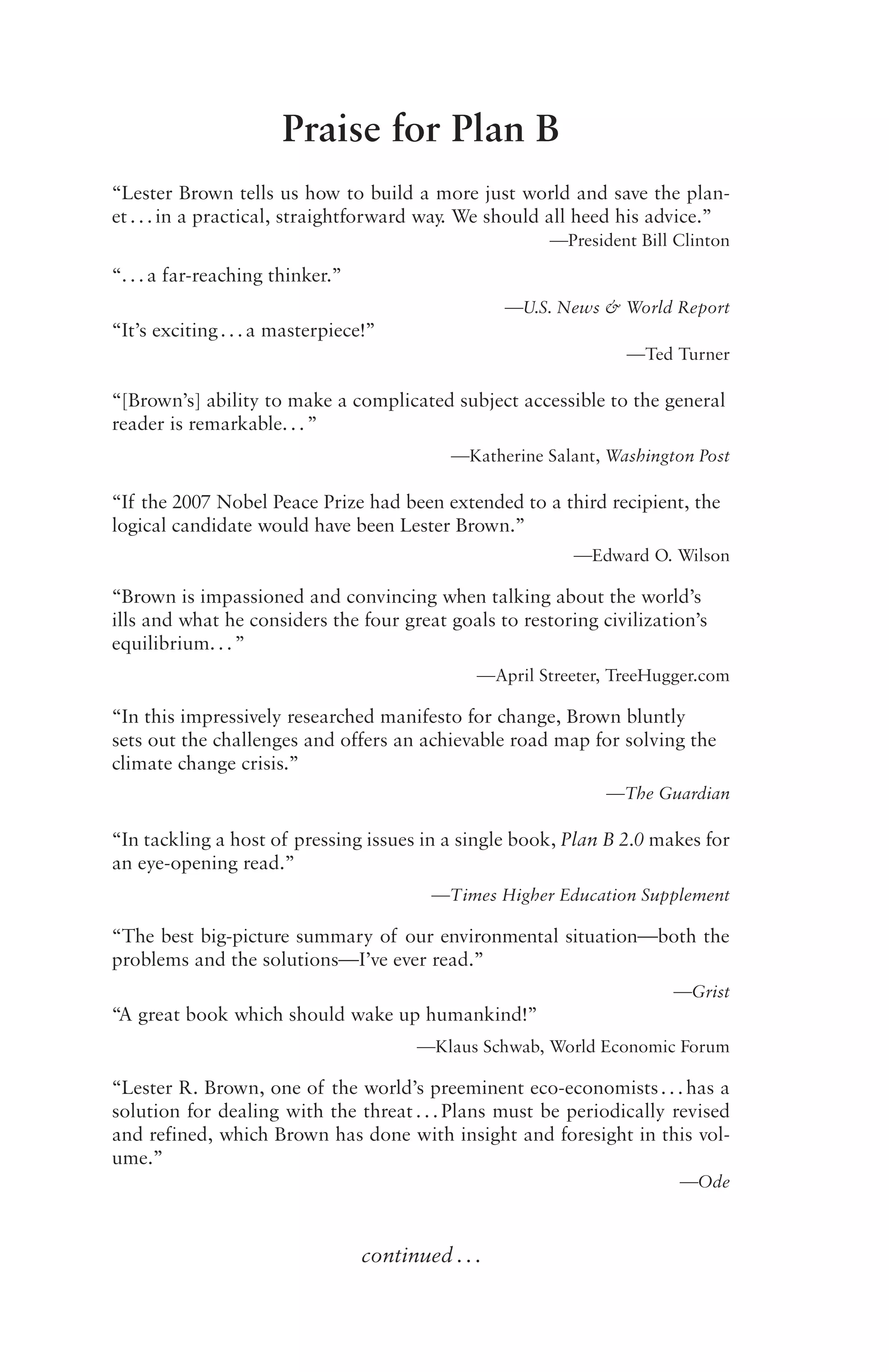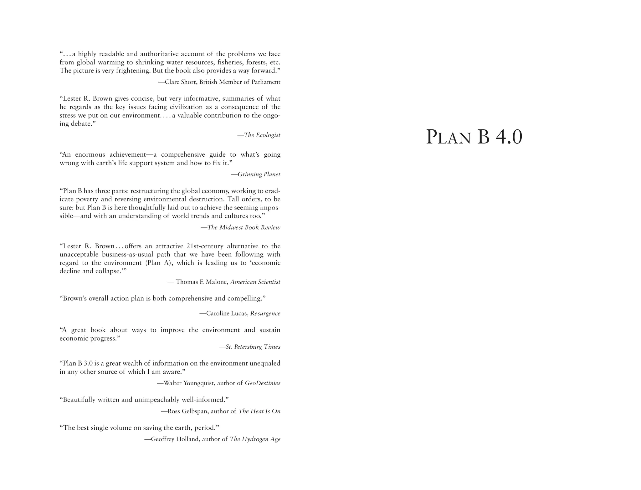 Lester Brown's 'Plan B' emphasizes the urgent need for a comprehensive approach to address environmental crises, including climate change, food scarcity, and economic decline. The book outlines strategies for restructuring the global economy, eradicating poverty, and reversing environmental degradation. It has been praised by notable figures for its practical solutions and insightful analysis of current global challenges.