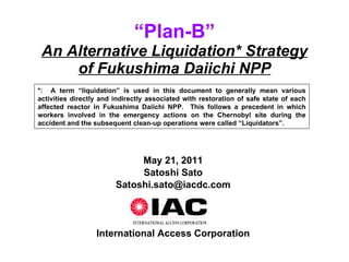 The document discusses potential strategies for decommissioning the damaged Fukushima Daiichi nuclear power plant reactors and spent fuel pools, referred to as "Plan-B Liquidation Strategies". It notes that dismantling the damaged reactors will be extremely challenging due to the harsh radiation environment. Leaving the reactors and spent fuel pools as they are is proposed as one option, but it would require public and regulatory approval.