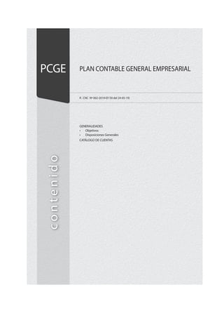 This document outlines the objectives and general provisions of Peru's Plan Contable General Empresarial (PCGE), or General Business Accounting Plan. The PCGE aims to standardize financial reporting in Peru according to International Financial Reporting Standards (IFRS). It provides codes for entities to record transactions and produce financial statements that reflect their financial position, performance, and cash flows. The PCGE structure accounts through five digits to classify balances and disaggregate information. Entities must use accrual accounting and the double-entry method. The document also summarizes key concepts from the IFRS Conceptual Framework that provide the basis for the PCGE.