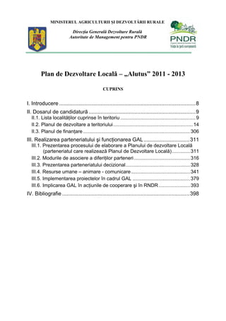 Documentul detaliază Planul de Dezvoltare Locală pentru perioada 2011-2013, incluzând analize ale teritoriului, parteneriatele necesare și măsurile propuse pentru dezvoltarea rurală. Este structurat în mai multe secțiuni, abordând aspecte precum geografia, economia locală, infrastructura și resursele umane. De asemenea, se oferă un cadru logic pentru implementarea proiectelor, evaluarea riscurilor și finanțarea necesară.